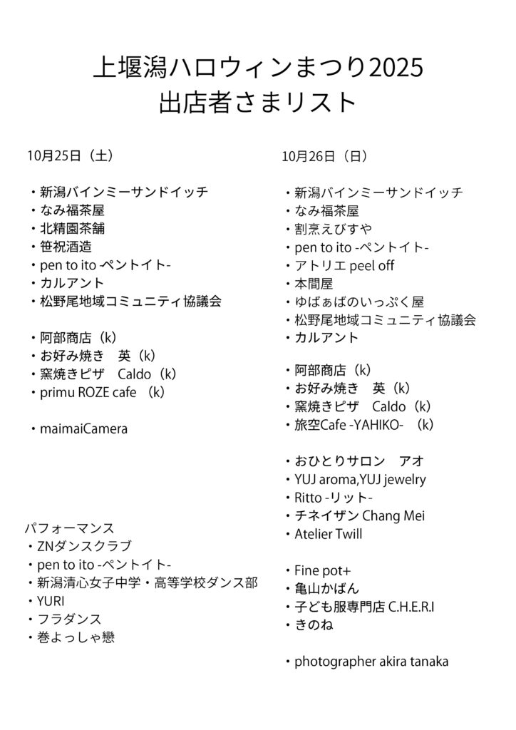 2025年10月7日 2025年10月8日 matsunoo_mirai お知らせ 上堰潟ハロウィンまつり2025ブース出展者 10月25日(土曜)~26日(日曜)各日の出展者が決定しましたのでお知らせします。 すでに公開・配布されたチラシと若干変更がありますが、こちらが最新版です。(令和7年10月7日)